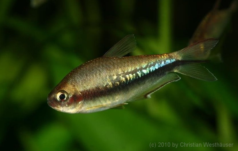 Bei Nematobrycon lacortei handelt es sich um einen farblich sehr ansprechenden Salmler, dessen natürliches Verbreitungsgebiet in West-Kolumbien (San Juan River-Becken) liegt. Meine ausgewachsenen Männchen erreichen eine Totallänge von 60-70 mm, die Weibchen bleiben mit ca. 50 mm etwas kleiner. Die Geschlechter lassen sich problemlos anhand der Augenfarbe unterscheiden: Bereits im Alter von drei Monaten (20 mm Totallänge) entwickeln die Jungmännchen eine rote Iris. Die Weibchen haben im Gegensatz dazu eine türkise Iris. Eine weitere Besonderheit der Männchen ist die mittig spitz ausgezogene Schwanzflosse (dieser "Zipfel" ist je nach Alter und Größe des Fisches bis zu 5 mm lang; bei Weibchen existiert dieser Flossenauszug nur ansatzweise). Auch die fantastische Färbung, die wirklich alle Farben eines Regenbogens enthalten kann, ist dem männlichen Geschlecht vorbehalten. Leider ist sie nicht immer zu sehen: Bei adulten, nicht imponierenden Männchen ist die obere Körperhälfte oft kräftig kupferfarben/braun und die untere Körperhälfte zeigt vom Kopf an ein Braun, dass ab der Körpermitte in ein dunkles Blau übergeht. Haltung und Sozialverhalten: