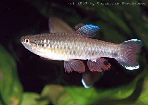 Meine Männchen erreichten Totallängen von bis zu 105 mm. Damit überschreitet diese Art die in der mir zugänglichen Literatur angegebenen Totallängen beträchtlich. Die Geschlechter lassen sich bei geschlechtsreifen Tieren an der Form der Bauchflossen unterscheiden: Männchen haben kantige, fast rechteckige Bauchflossen, Weibchen dagegen rundliche, ovale Bauchflossen. Weitere Unterschiede zwischen den Geschlechtern sind die Körpergröße und die Färbung. Männchen werden insgesamt größer und kräftiger und auch nur bei ihnen sind die Schwanzflossenlappen weiß bis hellblau eingefasst. (Die Fotos zum Text zeigen ausschließlich männliche Tiere) Jungfische haben neben der schmalen, schwarzen Längsbinde, welche vom Mund bis hinter den Kiemendeckel reicht, auf den Flanken drei schwarze Flecken. Mit zunehmendem Alter verschwinden diese Flecken fast vollständig und werden nur noch bei starker Erregung (z. B. durch Anwesenheit eines neuen Artgenossen) gezeigt. Pflege und Beobachtungen im AquariumMitte April 2003 bekam ich sechs Jungtiere von Wildfangnachzuchten aus Peru. Mich interessierte besonders die Fortpflanzung, das innerartliche Verhalten in einem großen Aquarium sowie die Endgröße. Gepflegt habe ich die sechs Jungfische in meinem Wohnzimmeraquarium (160x60x60 cm; Temperatur um 25 °C; Leitfähigkeit ca. 150 µS/cm). Vergesellschaftet wurden sie erst mit einer Gruppe Nannostomus trifasciatus, später mit Brillantsalmlern. Meine Pyrrhulina spilota wuchsen bei regelmäßiger Fütterung mit Lebendfutter zügig heran und erreichten bald die Geschlechtsreife. Alle sechs Tiere entpuppten sich dabei als Männchen. Gefüttert wurden sie vorrangig mit Tümpel- und Frostfutter sowie Drosophila. Mit zunehmender Größe (Anfang Juni hatten sie Totallängen von 35-45 mm erreicht) wurden auch Stubenfliegen sowie kleine Grashüpfer gierig gefressen. Größere Insekten schnappen sie und würgen diese nach Möglichkeit in einem Rutsch, mit Hilfe von "schlägelnden" Körperbewegungen, herunter. Jungfische fressen sich bei der Fütterung regelrecht eckige Bäuche an, was den Fischen jedoch augenscheinlich nicht schadet. Mit zunehmender Körpergröße lässt der Appetit jedoch spürbar nach. Auch in der Wachstumsphase konnte ich nicht beobachten, dass sich meine P. spilota an reichlich vorhandenen jungen Brillantsalmlern vergriffen hätten.