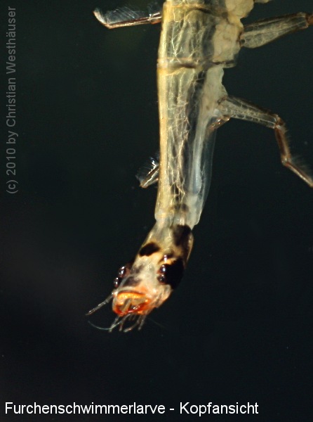 Furchenschwimmer zählen zu den Schwimmkäfern. Kleine Larven des Furchenschwimmers konnte ich bisher hauptsächlich waagrecht im Wasser stehend beobachten, große Larven (wie die Abgebildete) mit dem Schwanzende an der Wasseroberfläche "hängend". Die Larven können bei Gefahr durch springende (schnelzende) Fortbewegung sehr schnell flüchten. Im Vergleich zur Larve des Gelbrandkäfers sind die Mundwerkzeuge nur gering ausgebildet.