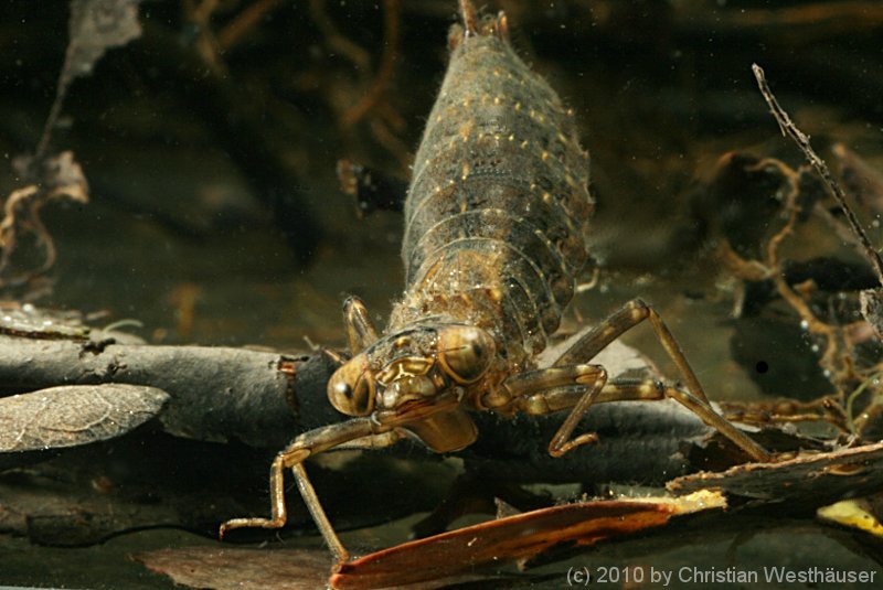 Zur Färbung: Großlibellenlarven sind (dunkel)braun, Kleinlibellenlarven dagegen meist beige bis grün.