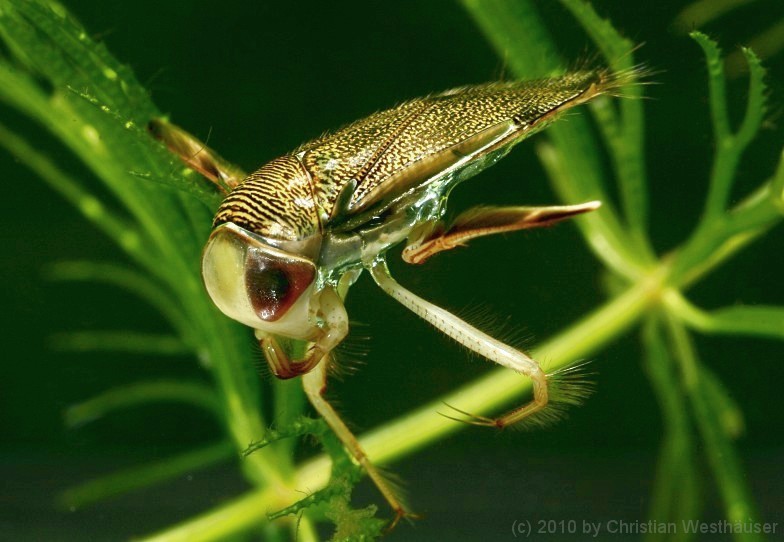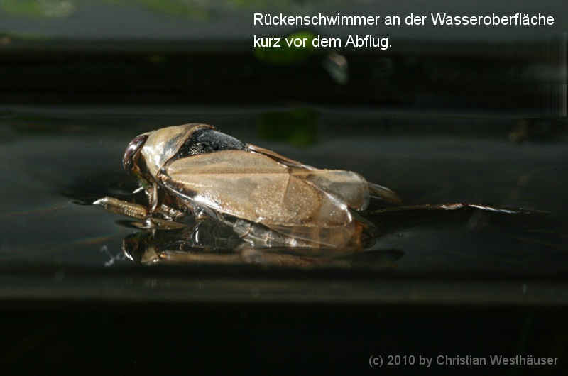 Ruderwanzen können übrigens auch fliegen (Foto eines Rückenschwimmers in Abflugposition).