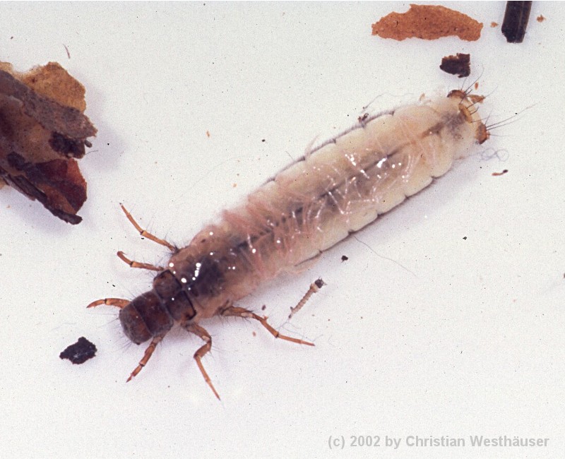 Von den 314 (NEU, P. J. 2002a) in Deutschland vorkommenden Köcherfliegenarten ist für mich als Aquarianer nur die abgebildete Art von Interesse. Sie ist im Frühjahr häufig in temporären Wasserlachen im Wald (zusammen mit Schwarzen Mückenlarven) zu finden. Die Larven werden bis ca. 30 mm lang. Der Köcher wird bei den abgebildeten Tieren immer aus Eichenlaub