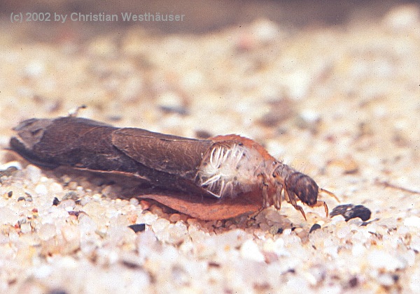 ins Aquarium. Der Köcher wird zwar nicht von den Fischen gefressen, aber es entsteht doch eine nicht unerhebliche Beschäftigung für die Fische um an das begehrte Futter zu gelangen: Die Larve muss im richtigen Moment am Kopf gepackt und aus