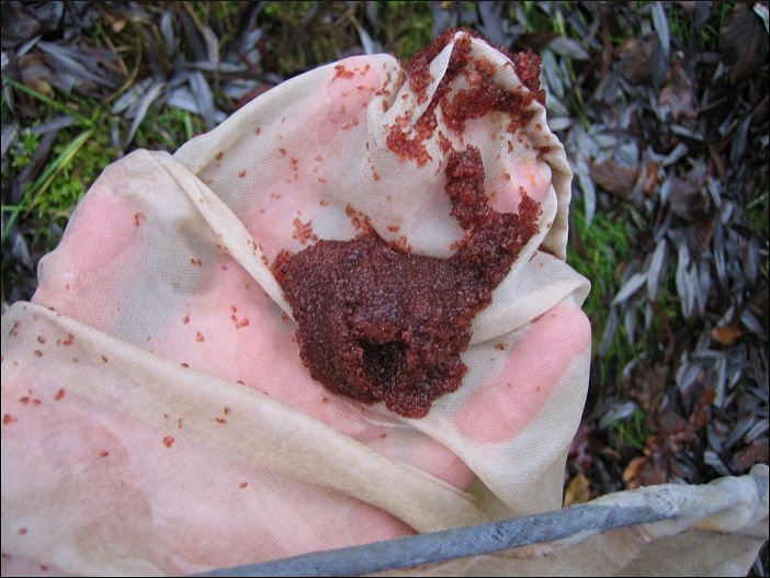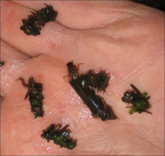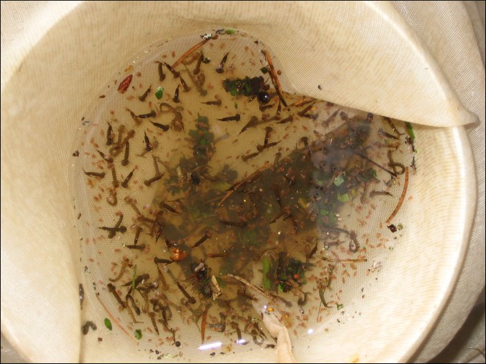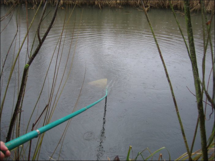 Tümpeltour: 07. Januar 2007Temporärer Tümpel (große Wasserlache) im Wald. Der Wasserstand beträgt kaum mehr als 50 cm. Köcherfliegenlarven bzw. ihre Behausung auf der offenen Hand fotografiert. Die Köcher sind hier aus Blättern und Tannennadeln gebaut. Die Ausbeute ist zwar nicht riesig, aber es hat sich gelohnt. Man darf nicht vergessen, dass es erst Anfang Januar ist. Ein kleinerer, unbewirtschafteter Teich - glücklicherweise noch ohne eingeschleppte Fische. Der milde Winter macht es möglich: reiche Ausbeute an Wasserflöhen. Tümpeltour: Januar 2005. Hier gab es noch einen richtigen Winter. |