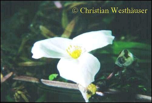 Regelmäßig wird ein Blütenstiel gebildet, der innerhalb weniger Tage die Wasseroberfläche erreicht und darüber hinauswächst. Die großen, weißen Blüten haben einen Durchmesser von ca. 3 cm; an den Blattquirlen bilden sich submers wie emers Tochterpflanzen.