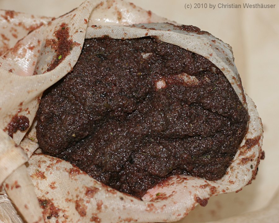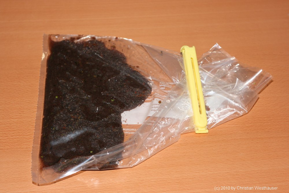 Frostfutter selbst herstellen (aus fangfrischem Tümpelfutter)Ich habe es jahrelang abgelehnt, Tümpelfutter selbst einzufrieren, da ich nicht im Besitz eines Schockfrosters bin und ich bisher einen solchen als notwendig ansah, um die Futtertiere ohne Schädigung der Zellen einzufrieren (siehe hierzu BREMER, Seite 132 und 133). Dieses Jahr (Frühjahr 2010) habe ich es dann doch mit dem Selbsteinfrieren versucht. Die Gründe dazu waren einerseits die teils unbefriedigende Qualität des von mir in den letzten Jahren gekauften Frostfutters und andererseits die saisonal extrem große Verfügbarkeit von Lebendfutter, wie z. B. Schwarze Mückenlarven im Frühjahr. ![]() Ein weiterer Grund zu eigenen Versuchen war sicherlich auch, dass unser Gefrierschrank eine Taste für "Superfrost" besitzt - also eine Möglichkeit, die Temperatur relativ schnell abzusenken (hier ein kleines Danke an die Fa. Liebherr). Und so habe ich es dann auch gewagt, frei nach dem Motto: Schlechter als das gekaufte Frostfutter kann mein eigenes Frostfutter gar nicht werden. Wichtig erscheint mir, dass man das frisch gefangene Tümpelfutter möglichst schnell und auch lebendig nach Hause transportiert und anschließend gleich weiterverarbeitet. Auch sollte man den Gefrierschrank bzw. die Gefriertruhe bereits vor der Tümpeltour auf die tiefst mögliche Temperatur einstellen. Vorteilhaft ist es, wenn der Gefrierschrank bzw. die Tiefkühltruhe eine Temperaturanzeige hat. Unser Gefrierschrank schafft es mit aktivem "Superfrost" innerhalb einer relativ kurzen Zeit auf eine Temperatur von -28 °C, über Nacht auf -34 °C, was für ein schnelles Durchfrieren der Futtertiere ausreicht. Mit höheren Temperaturen - also kleinerer Zahl vor dem Minus - habe ich keine Erfahrung. Ich vermute jedoch, dass die Qualität des Frostfutters darunter leidet. Der Grund ist einfach: Zellflüssigkeit bildet bei niedrigerer Temperatur und schnellem Gefrieren kleinere Eiskristalle als bei höherer Temperatur. Dauert das Durchfrieren länger, bilden sich größere Eiskristalle und die Gefahr von aufplatzenden Zellen der Futtertiere ist größer. Weitere Infos gibt es hierzu z. B. bei wikipedia.org. Gerade Tümpelfutter mit einem hohen Anteil an Wasserflöhen reagiert empfindlich auf lange Transportzeiten, aber auch Schwarze Mückenlarven sterben schnell ab, wenn die einzelnen Larven aufgrund einer hohen Besatzdichte im Transporteimer keine Möglichkeit haben, an der Wasseroberfläche zu atmen. Daher teile ich den Fang auf mehrere (zwei bis drei) 5l-Eimer auf und fahre unmittelbar nach dem Fang nach Hause. Und dann zu Hause: